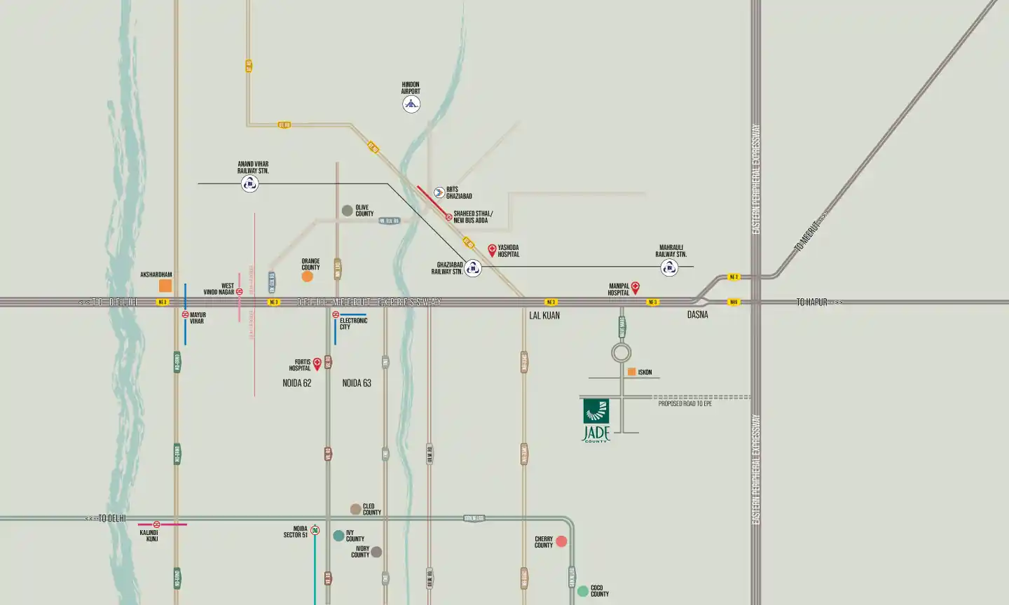 Jade County is a modern high-rise residential project spread over 13 acres with 9 towers and more than 1,000 premium 3, 4, and 5 BHK homes. The size of apartments starts from 2358 sq.ft. to 5094 sq.ft. Located near the Delhi-Meerut Expressway, it offers smooth connectivity to Delhi and other NCR areas. This IGBC Gold-rated project promotes eco-friendly living with energy-saving features and a healthy environment. Inspired by the beauty of Jade Stone, the design perfectly combines indoor comfort with open green spaces. A large central park with a calm water body and a grand clubhouse offers peaceful views, while spacious lobbies and double-height areas create a luxurious and open living experience.